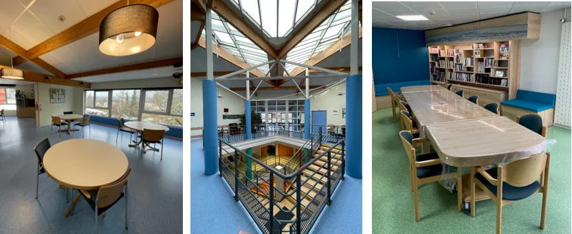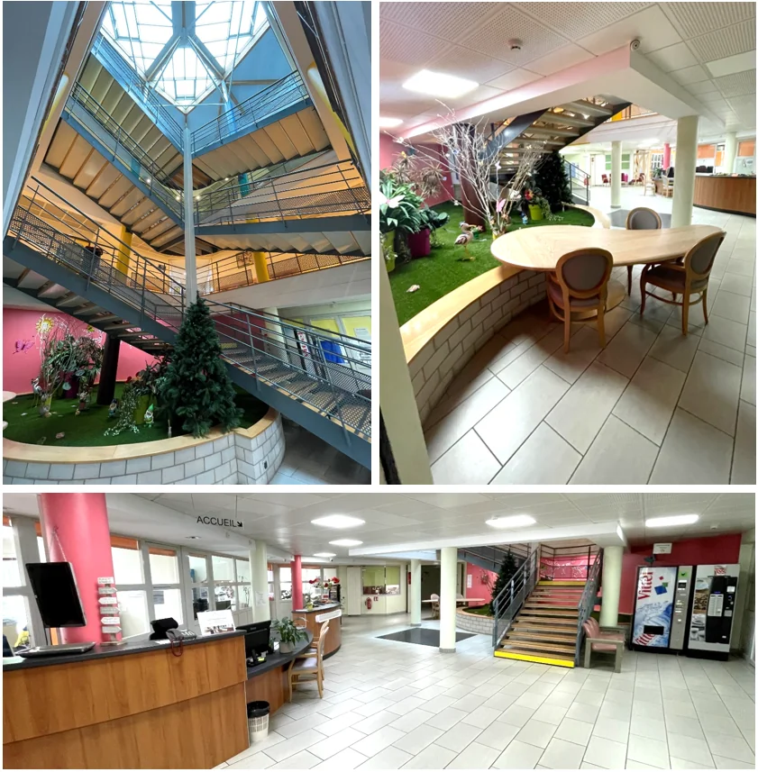 Une bibliothèque avec terrasse est accessible au 1er étage, ainsi qu’une salle d’activité avec cuisine thérapeutique au 2ème étage.